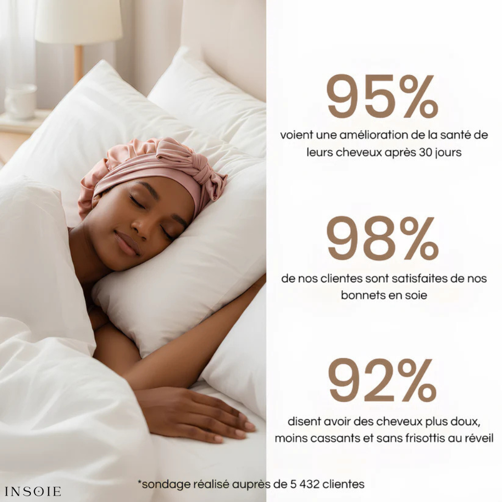 Marre de passer 20 minutes à démêler vos cheveux ou à lisser vos frisottis chaque matin ? Le bonnet INSOIE™ protège vos cheveux contre la friction de l'oreiller, responsable de 80% de la casse.